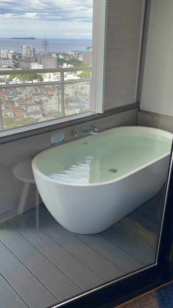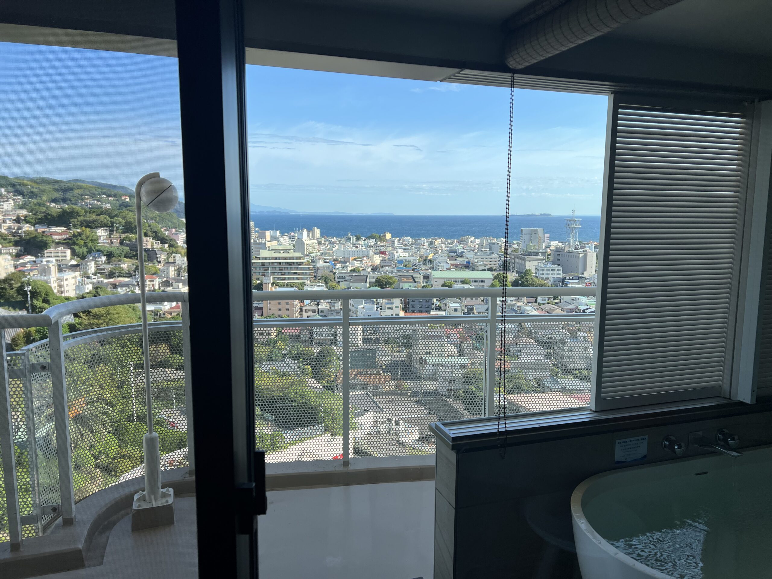 最上階部屋付き露天風呂から眺める伊豆も街並み、海の絶景