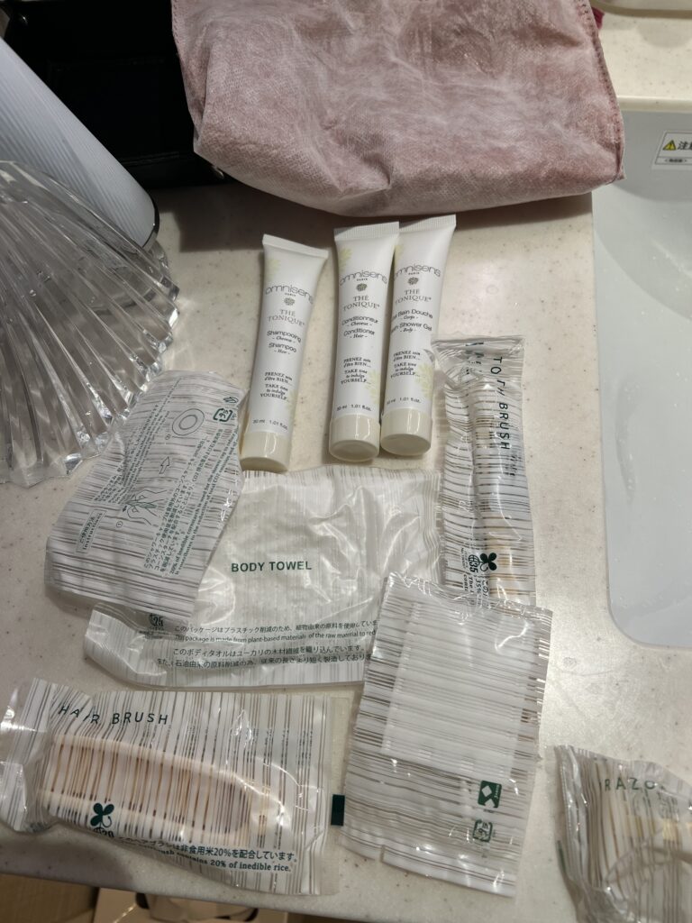 そしてなんと!洗面台横にあったアメニティセットには備え付けのものとは別にシャンプー、リンス、ボディソープのセットがそれぞれ入っていました