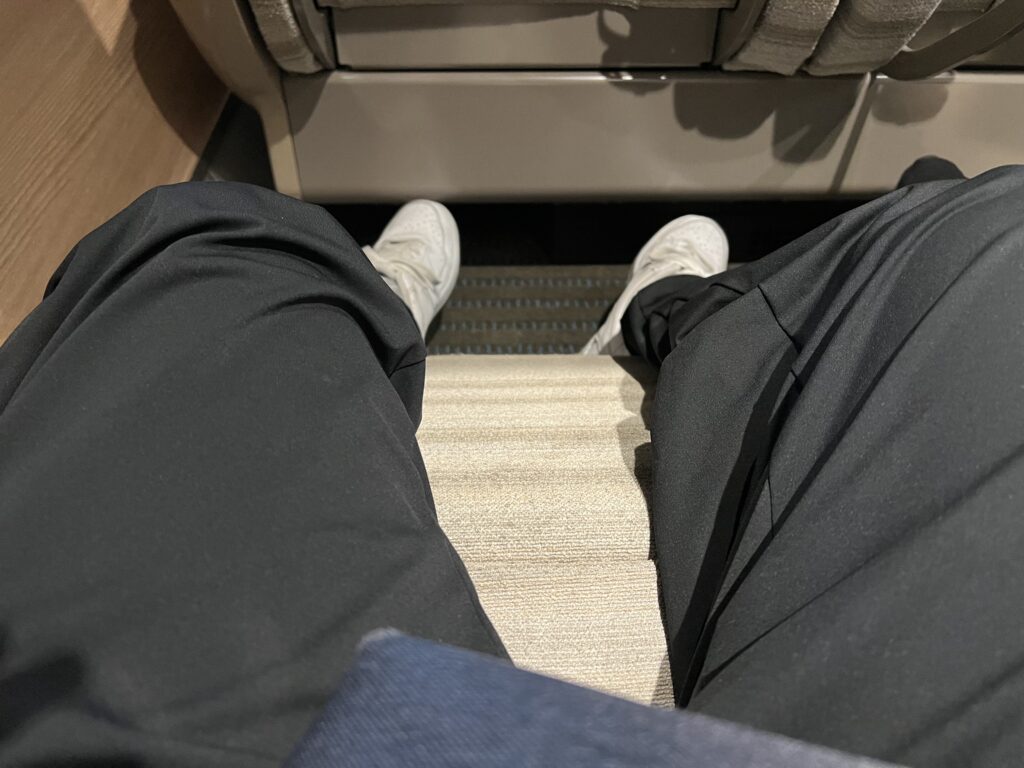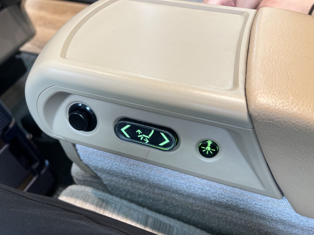 こちらのボタンでフットレストを操作します。最大でほぼ水平まで上がってきて「これは寝れるな」と感じました